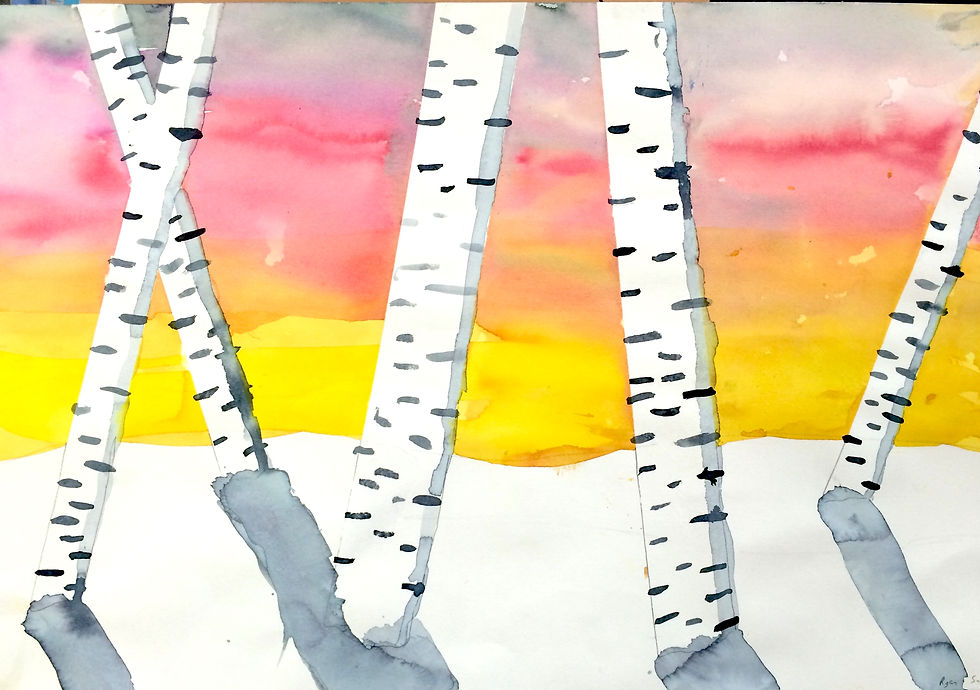 Sixth graders used color, shapes, texture, lines, space, and value to create these brilliant winter scenes! Students studied how shadows, light, and dimension can be portrayed with varying tints, shades, and intensities of watercolor. Some students experimented with using salt to produce unique and beautiful effects.