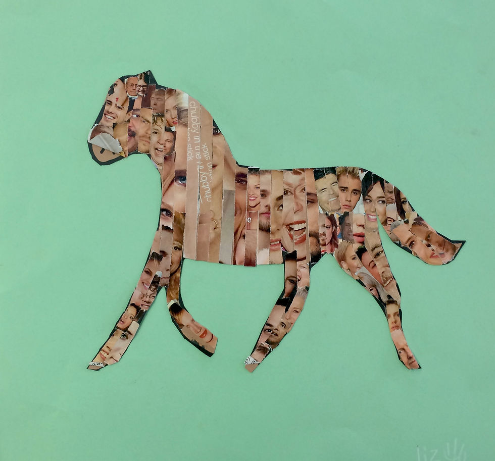 For Earth Day, sixth graders used recycled magazines to create vibrant collages. They used contrasting tones and values to create distinct positive and negative space in their images. The results were outstanding!